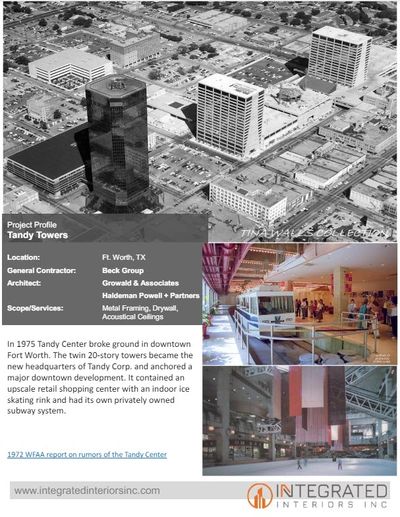 In 1975 Tandy Center broke ground in downtown Fort Worth. The twin 20-story towers became the new headquarters of Tandy Corp. and anchored a major downtown development. It contained an upscale retail shopping center with an indoor ice skating rink and had its own privately owned subway system.